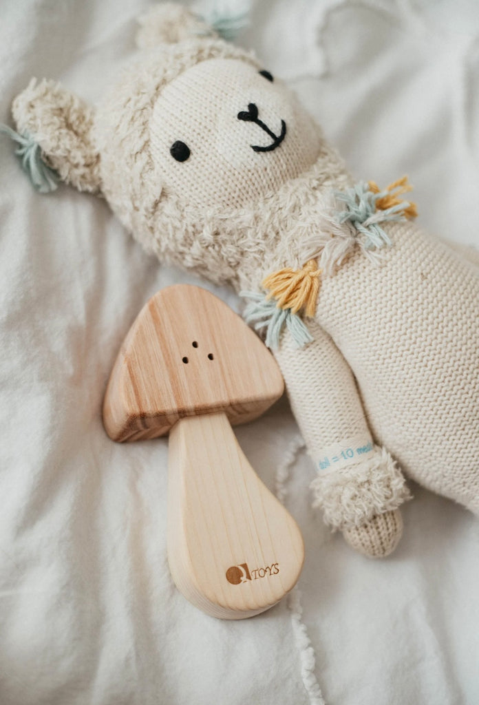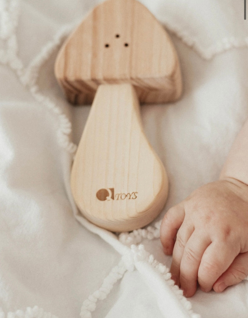 Introducing our Mushroom Rattle from the delightful QToys beautiful baby deluxe range! Crafted with care, this delightful rattle emanates a subtle, warm sound, promising endless hours of joyful exploration and learning for your little one.